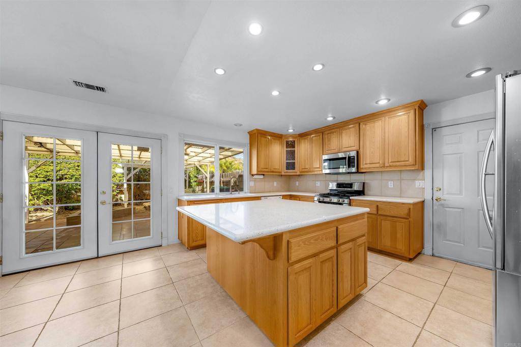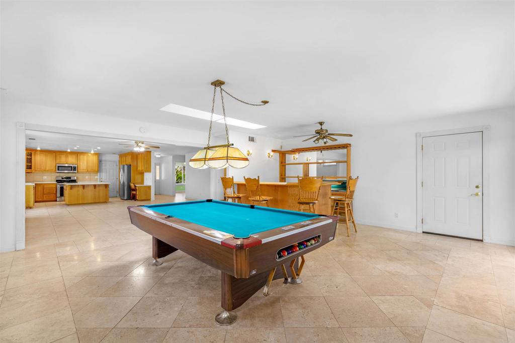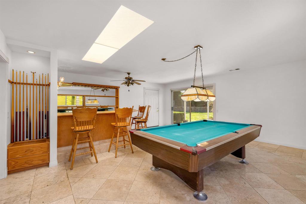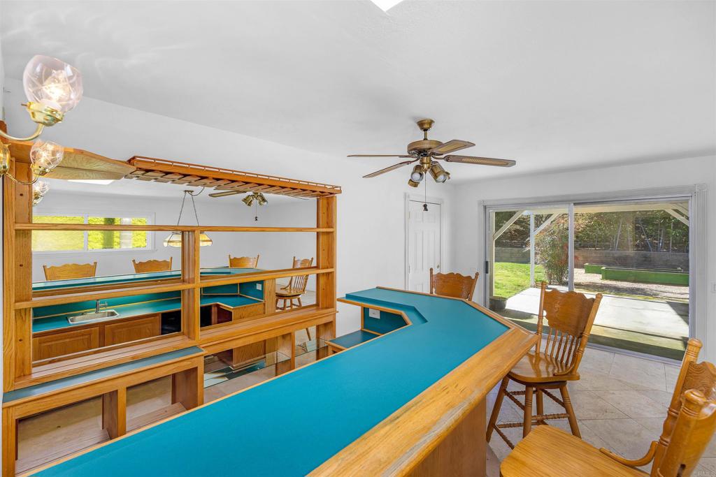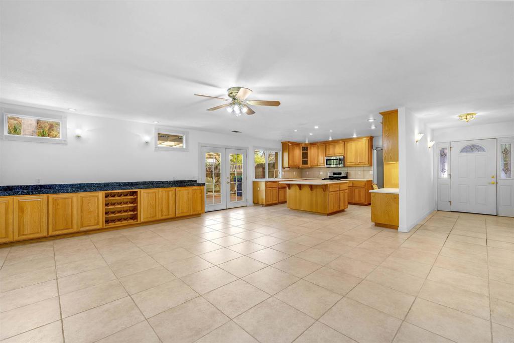 Nestled at the base of the picturesque Mount Helix, this remarkable property awaits your arrival on a peaceful cul-de-sac, offering an ideal blend of serene surroundings. Step inside and be greeted by an expansive open floor-plan that seamlessly connects the various living spaces. The heart of the home is the generously sized kitchen, equipped with stainless steel appliances, an inviting island, and an abundance of counter space, making it a chef's delight. The living room opens graciously with a warm fireplace, creating a cozy ambiance for gatherings or quiet evenings. Adjacent to this, a spacious family room featuring a bar provides an excellent space for entertaining. Illuminate your living spaces with the modern touch of recessed lighting, enhancing the overall atmosphere of the home. The large primary suite offers a private sanctuary, complemented by spacious bedrooms ensuring comfort for every member of the household. For those who enjoy hands-on projects, a dedicated workshop area adds versatility to the property, providing space for creative endeavors and hobbies. Step outside and discover shaded seating areas surrounded by meticulously landscaped gardens, palm trees, and planters. Additionally, delight in the presence of fruit trees, including orange, lemon, and avocado, adding a touch of nature to your backyard. Practicality meets style with a newer roof, ensuring durability and peace of mind. This residence is not just a home; it's a harmonious blend of a fantastic location, thoughtful design, and natural beauty at the base of Mount Helix. Seize the opportunity to make this extraordinary property your own. Call now!